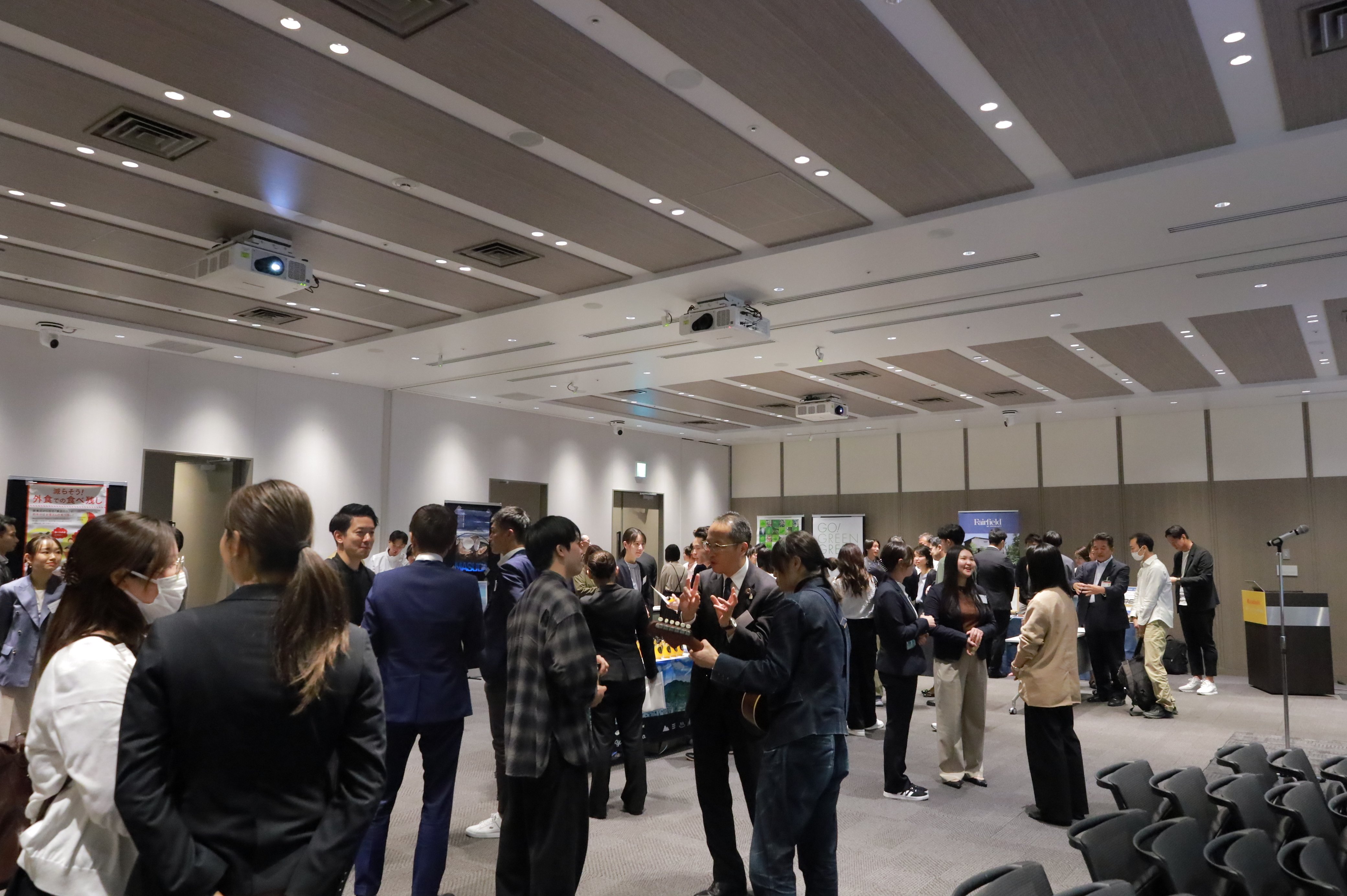 発表会終了後には、協賛企業や自治体がブースを出展し、学生・関係者間の活発な交流が行われました。積水ハウス様によるフェアフィールド・バイ・マリオット 道の駅プロジェクトのホテルガチャ抽選会や、愛媛銀行様よりご提供いただいたみかんジュースの試飲、クラダシと共同研究を実施している茨城大学の干し芋を活用したはしっぽアイス販売など、地域の特産品・魅力が紹介され、和やかな雰囲気の中、各回のクラチャレやピッチアワードの提案についての会話など、関係者同士の情報交換も活発に行われました。