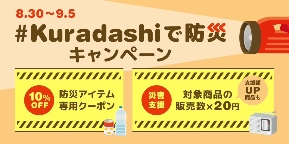 Kuradashiサイトで販売中の防災アイテムを【10%OFF】でおトクに購入でき、購入数に応じて能登半島地震緊急支援へ寄付をすることができます。