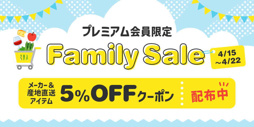 プレミアム会員限定!シークレットなFamily Saleを開催します。対象商品5%OFFの特別なクーポンで、プレミアム会員だけのおトクなお買い物をお楽しみください。