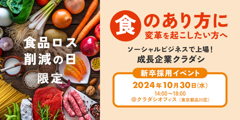 10月30日の「食品ロス削減の日」に合わせて、本社オフィスで開催されるイベントでは、創業者や社員との対話を通じて、当社「クラダシ」についてご紹介します。