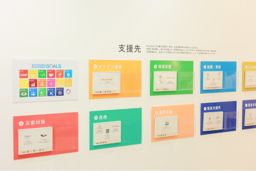店内でお買い物すると、支援したい活動や団体をお客さま自身で選べる仕組みを導入。みなさんのお買い物金額の一部が社会貢献活動の支援に充てられます。