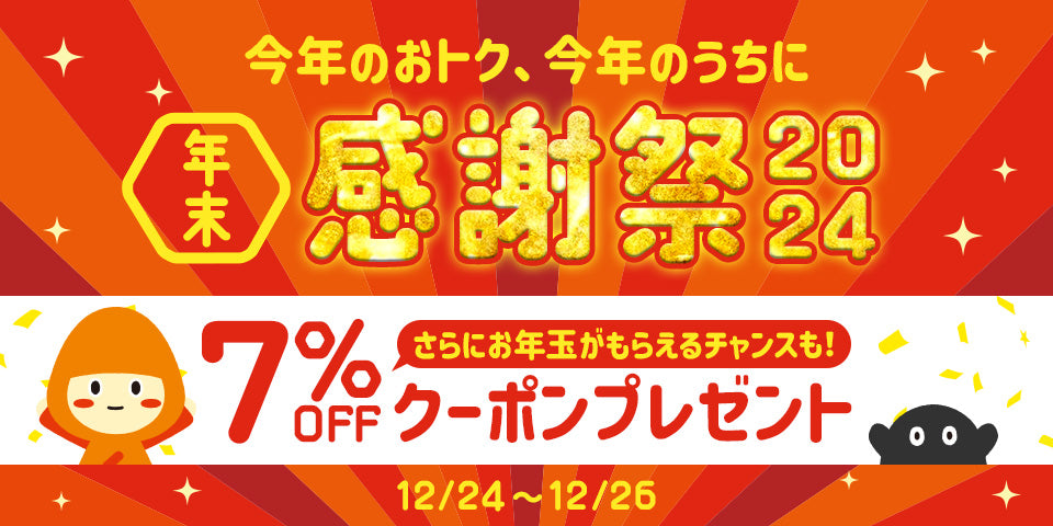 みなさんへの感謝の想いを込めて、2,200円(税込)以上のすべての商品に使える【7%OFFクーポン】をプレゼントします!また期間中にクーポンを使ってお買い物をされた方には、年明けにお年玉クーポンも贈呈!