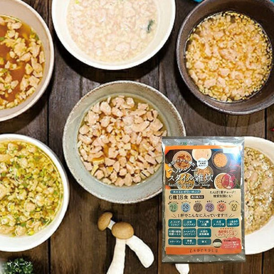 | 原材料名 | 【和風生姜】粒状大豆たんぱく、コラーゲンペプチド、難消化性デキストリン、食塩、グラニュー糖、乾燥わかめ、生姜粉末、鰹加工品(デキストリン、食塩、鰹節、サバ節、その他)、粉末醤油、乾燥ねぎ、昆布粉末、食用植物油脂、植物発酵酵素エキス、こんにゃくマンナン、カルニチン、調味料(アミノ酸等)、ゲル化剤(増粘多糖類)、カラメル色素、ビタミン(C、A、D、E、B1、B2、B6、B12)、葉酸、ナイアシン、パントテン酸、(原材料の一部に大豆、ゼラチン、サバ、小麦、卵、乳を含む) 【海鮮シーフード】粒状大豆たんぱく、コラーゲンペプチド、難消化性デキストリン、チキンパウダー(チキンエキス、デキストリン、加工でん粉他)、ポークパウダー(ポークエキス、デキストリン、加工でん粉他)、ホタテパウダー(ホタテエキス、食塩、デキストリン他)、砂糖、胡椒、ガーリックパウダー、オニオンパウダー、こんにゃくマンナン、植物発酵エキス、食用植物油脂、調味料(アミノ酸等)、ゲル化剤(増粘多糖類)、ビタミン(C、A、D、E、B1、B2、B6、B12)、葉酸、ナイアシン、パントテン酸(原材料の一部に大豆、鶏肉、豚肉、小麦、ゼラチンを含む) 【うま辛チゲ】粒状大豆たんぱく、味噌、コラーゲンペプチド、難消化性デキストリン、食塩、乾燥キャベツ、ごま、キムチパウダー(白菜キムチピクルスジュース、魚醤、デキストリン他)、グラニュー糖、ガーリック、ポークエキス、唐辛子、粉末醤油、ガーリックパウダー、チキンパウダー、ホワイトッペパー、レッドペッパー、こんにゃくマンナン、植物発酵エキス、食用植物油脂、ジンジャー末、調味料(アミノ酸等)、ゲル化剤(増粘多糖類)、ビタミン(C、A、D、E、B1、B2、B6、B12)、葉酸、ナイアシン、パントテン酸(原材料の一部に小麦、大豆、ゼラチン、豚、鶏、えび、かにを含む) 【スパイシーカレー】粒状大豆たんぱく、コラーゲンペプチド、難消化性デキストリン、食塩、グラニュー糖、カレー粉(カレー粉、小麦粉、ラード、その他)、乾燥ねぎ、ぶどう糖、鰹エキス(デキストリン、食塩、鰹、その他)、胡椒、オニオンパウダー、唐辛子、ガーリックパウダー、こんにゃくマンナン、植物発酵エキス、食用植物油脂、調味料(アミノ酸等)、ゲル化剤(増粘多糖類)、ビタミン(C、A、D、E、B1、B2、B6、B12)、葉酸、ナイアシン、パントテン酸(原材料の一部に小麦、大豆、ゼラチン、豚、サバを含む) 【ごぼう】粒状大豆たんぱく、コラーゲンペプチド、難消化性デキストリン、食塩、ごぼう、ごま、乾燥わかめ、グラニュー糖、ガーリックパウダー、オニオンパウダー、粉末醤油、チキンエキス、カレー粉、胡椒、こんにゃくマンナン、植物発酵エキス、食用植物油脂、調味料(アミノ酸等)、ゲル化剤(増粘多糖類)、ビタミン(C、A、D、E、B1、B2、B6、B12)、葉酸、ナイアシン、パントテン酸(原材料の一部に大豆、小麦、ゼラチン、鶏、乳を含む) 【きのこ汁】粒状大豆たんぱく、コラーゲンペプチド、難消化性デキストリン、椎茸、椎茸粉末、食塩、グラニュー糖、鰹加工品(デキストリン、食塩、鰹節、サバ節、その他)、粉末醤油、昆布粉末、こんにゃくマンナン、植物発酵エキス、食用植物油脂、調味料(アミノ酸等)、ゲル化剤(増粘多糖類)、カラメル色素、ビタミン(C、A、D、E、B1、B2、B6、B12)、葉酸、ナイアシン、パントテン酸、(原材料の一部に大豆、ゼラチン、サバ、小麦を含む) |