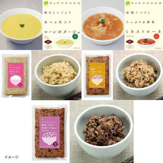 | 内容量 | コーンポタージュ:160g×2、ミネストローネ:160g×2、玄米ごはん:160g×2、黒米と小豆と玄米のごはん:160g×2、雑穀と玄米のごはん:160g×2 |
