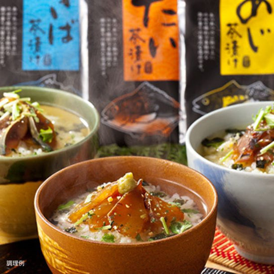 | 内容量 | 真鯛茶漬け:99g(30g×3、茶漬けのあられ3g×3)、真鯖茶漬け:99g(30g×3、茶漬けのあられ3g×3)、真鯵茶漬け:132g(30g×4、茶漬けのあられ3g×4) |