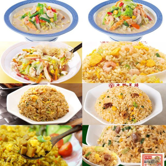 | 内容量 | リンガーハットの長崎ちゃんぽん(305g)×2、リンガーハットの野菜たっぷりちゃんぽん(395g)×2、リンガーハットの長崎皿うどん(244g)×2、直火炒めチャーハン(230g)×2、エビ塩チャーハン(210g)×2、カレーチャーハン(230g)×2、豚カルビチャーハン(210g)×2、パラッと炒めたねぎ塩チャーハン×2 |