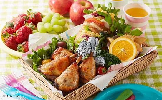 | 原材料名 | 【骨付きフライドチキン】鶏肉(九州産)、でん粉、しょうゆ、水あめ、植物油脂、食塩、砂糖、香辛料、卵白粉、チキンエキス、酵母エキス、衣(小麦粉、粒状植物性たん白、でん粉、クラッカー粉、食塩、デキストリン、卵白粉)、揚げ油 (パーム油)/加工でん粉、増粘多糖類、ベニコウジ色素、香辛料抽出物、(一部に小麦・卵・鶏肉・大豆を含む) 【モモロースト】鶏肉(九州産)、果糖ブドウ糖液糖、しょうゆ、香辛料、食塩、(一部に小麦・鶏肉・大豆を含む) ※本品製造工場では卵・乳成分を含む製品を製造しております。 【山賊焼き】鶏肉(九州産)、しょうゆ、でん粉、植物油脂、発酵調味料、砂糖、食塩、水あめ、香辛料、粉末状植物性たん白、豆板醤、卵白粉、清酒、オイスターソース/調味料(アミノ酸等)、カラメル色素、酸味料、香料、(一部に小麦・卵・鶏肉・大豆・ごまを含む) 【バジルのフライドチキン】鶏肉(九州産)、牛乳、植物油脂、食塩、こうじ調味料、香辛料、発酵粉乳、コーンフラワー、衣(牛乳、小麦粉、でん粉、コーンフラワー、粉末状植物性たん白、卵白粉、食塩、植物油脂、香辛料、酵母エキス、デキストリン、こうじ調味料、発酵粉乳、食物繊維、小麦グルテン分解物、ブドウ糖)/調味料(アミノ酸)、膨張剤、揚げ油(パーム油)、(一部に乳成分・小麦・卵・鶏肉・大豆・ごまを含む) 【どぶ漬から揚げレンジ】鶏肉(九州産)、たれ(砂糖、しょうゆ、その他)、水あめ、食塩、発酵調味料、香辛料、衣(でん粉、小麦粉、卵白粉)、揚げ油(パーム油)、(一部に小麦・卵・鶏肉・大豆を含む) 【恐竜チキンナゲット】鶏肉(国産)、鶏皮(国産)、植物油脂、つなぎ(粉末状植物性たん白、小麦 粉)、発酵調味料、酵母エキス、食塩、砂糖、しょうゆ、香辛料、衣 (小麦粉、コーンフラワー、でん粉、植物油脂、果糖ブドウ糖液糖、粉末状植物性たん白、砂糖、ブドウ糖、食塩、発酵調味料、香辛料、大豆粉)/着色料(パプリ力粉末、アナトー)、調味料(アミノ酸等)、酸味料、揚げ油(パーム油)、(一部に小麦・鶏肉・大豆・りんごを含む) |