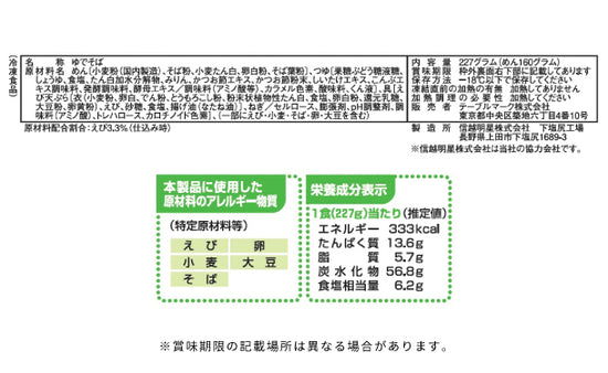| 原材料名 | めん〔小妻粉(国内製造)、そば粉、小麦たん白、卵白粉、そば葉粉)、つゆ〔果糖ぶどう糖液糖、しょうゆ、金塩、たん白加水分解物、みりん、かつお節エキス、かつお節粉末、しいたけエキス、こんぶ工キス調味料、発酵調味料、酵母エキス/調味料(アミノ酸等)、カラメル色素、酸味料、くん液〕、具〔えび天ぶら〔衣(小麦粉、卵白、でん粉、とうもろごし粉、粉末状植物性たん白、食塩、卵白粉、遠元乳糖、大豆粉、卵黄粉)、えび、砂糖、食塩、揚げ油(なたね油)〕、ねぎ/セルロース、膨張剤、pH調整剤、調味料(アミノ酸)、トレハロース、カロチノイド色素〕、(一部にえび・小麦・そば・卵・大豆を含む) |