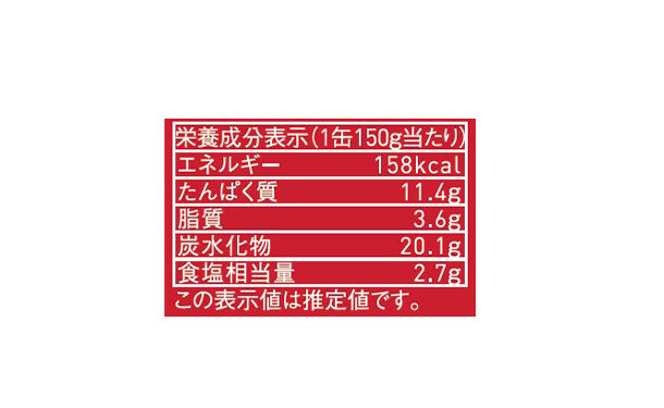 | 栄養成分 | (1缶85g当たり)エネルギー:179kcal、たんぱく質:1.2g、脂質:5.8g、炭水化物:30.6g、食塩相当量:0.1g |