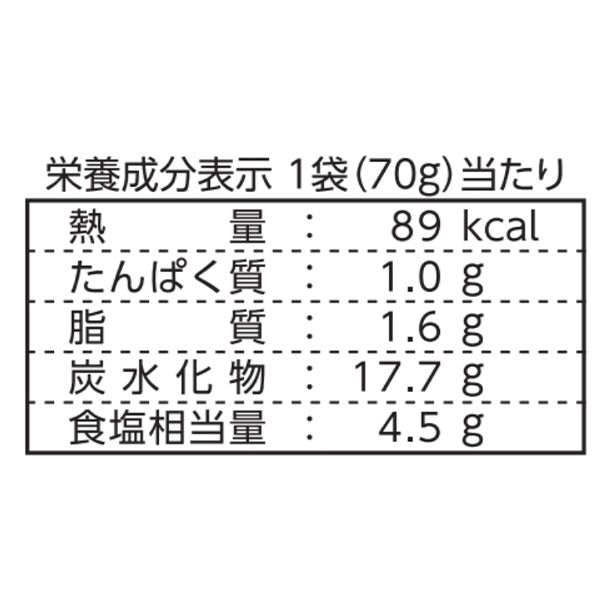| 栄養成分 | (1袋(8.8g)あたり)エネルギー:32kcal、たんぱく質:1.0g、脂質:1.1g、炭水化物:4.4g、食塩相当量:1.9g |