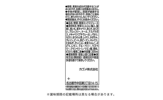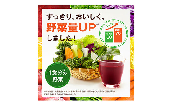 | 原材料名 | 野菜(にんじん(輸入、国産)、紫いも、紫キャベツ、赤じそ、はくさい、ブロッコリー、ケール、アスパラガス、メキャベツ(プチヴェール)、パセリ、セロリ、ほうれん草、レタス、かぼちゃ、クレソン、ビート、赤ピーマン、キャベツ、たまねぎ、だいこん)、果実(りんご、ぶどう、レモン、ブルーベリー、ラズベリー、クランベリー)/クエン酸、香料、ピロリン酸第二鉄 |