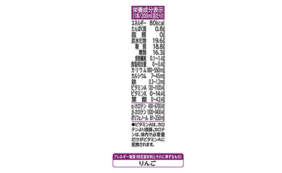 | 栄養成分 | (1本/200ml当たり)エネルギー:80kcal、たんぱく質:0.8g、脂質:0g、炭水化物:19.6g、食塩相当量:0~0.4g |