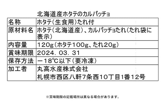| 原材料名 | ホタテ(北海道産)、カルパッチョたれ(たれ袋に表示) |