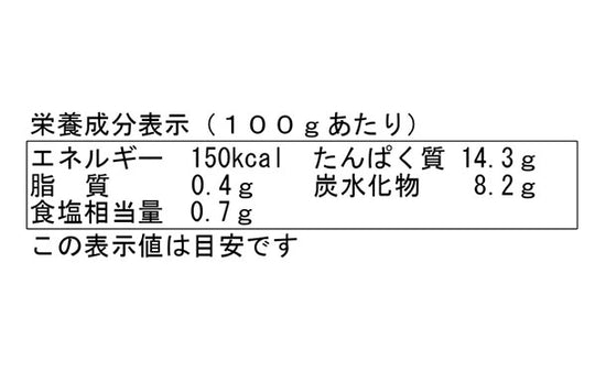 | 栄養成分 | (100gあたり)エネルギー:150kcal、たんぱく質:14.3g、脂質:0.4g、炭水化物:8.2g、食塩相当量:0.7g |