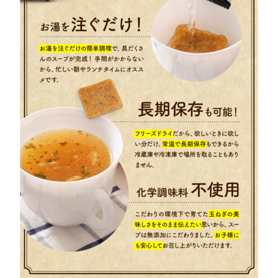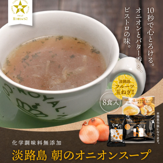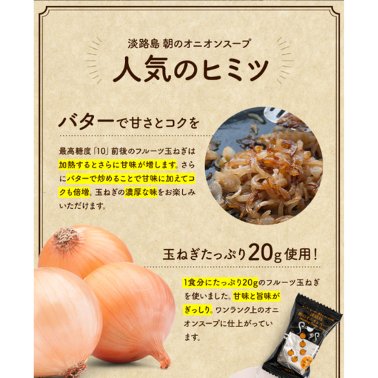 | 原材料名 | バターオイル、ポークエキス、チキンエキス、でん粉分解物、砂糖、食塩、たまねぎ粉末、しょうゆ、酵母エキス、具(たまねぎ(淡路島産)、乾燥パセリ)/酸化防止剤(ビタミンE)、(一部に乳成分・小麦・大豆・鶏肉・豚肉を含む) |
