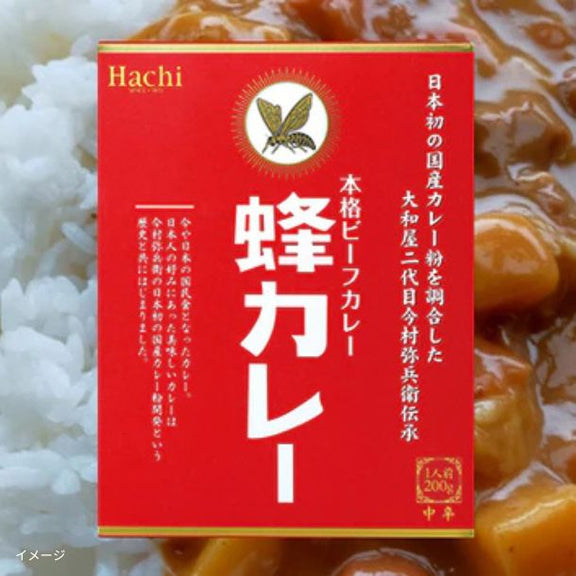 オリジナル製法にて製造された、「蜂カレーカレー粉」と「蜂カレーカレールー」を使用し、デミグラスソース、生クリーム、バターでコクをつけたソースに角切りの国産牛肉を加えて仕上げました。