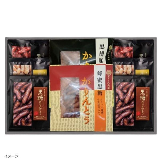 | 内容量 | 久兵衛黒胡麻かりんとう:40g、久兵衛蜂蜜黒糖かりんとう:40g、黒糖かりんとう:15g×2、黒胡麻かりんとう:15g×2、牛乳かりんとう15g×2 |