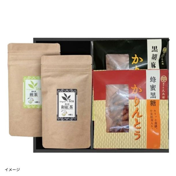 | 内容量 | 煎茶:30g(3g×10)、和紅茶:25g(2.5g×10)、蜂蜜黒糖かりんとう:40g、黒胡麻かりんとう:40g |