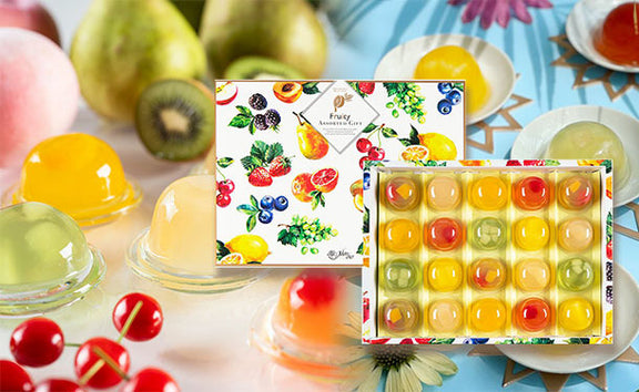 フルーツの果汁と果肉を使った、色とりどりに輝くゼリー。