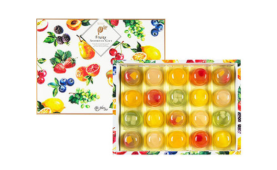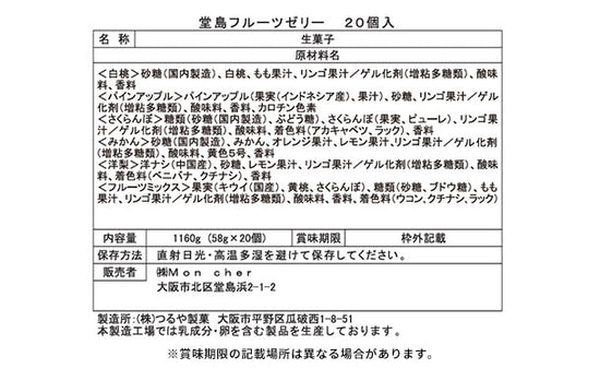 | 内容量 | 58g×20個(みかん:3個、パインアップル:3個、洋梨:3個、さくらんぼ:3個、白桃:4個、フルーツミックス:4個)/箱 |
