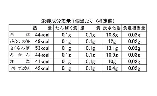 | 栄養成分 | (1個当たり) 【白桃】エネルギー:44kcal、たんぱく質:0.1g、脂質:0.1g、炭水化物:10.8g、食塩相当量:0.02g 【パインアップル】エネルギー:49kcal、たんぱく質:0.1g、脂質:0.1g、炭水化物:12g、食塩相当量:0.02g 【さくらんぼ】エネルギー:53kcal、たんぱく質:0.1g、脂質:0.1g、炭水化物:13.1g、食塩相当量:0.02g 【みかん】エネルギー:44kcal、たんぱく質:0.1g、脂質:0.1g、炭水化物:10.9g、食塩相当量:0.03g 【洋梨】エネルギー:41kcal、たんぱく質:0.1g、脂質:0.1g、炭水化物:10g、食塩相当量:0.02g 【フルーツミックス】エネルギー:42kcal、たんぱく質:0.1g、脂質:0.1g、炭水化物:10.4g、食塩相当量:0.02g |