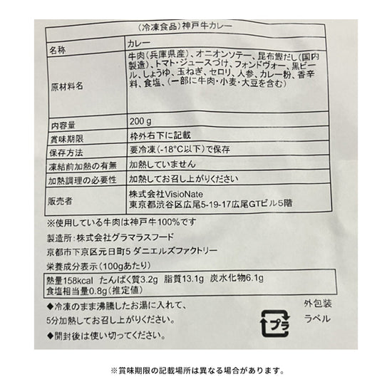 | 原材料名 | 牛肉(兵庫県産)、オニオンソテー、昆布鰹だし(国内製造)、トマト・ジュースづけ、フォンドヴォー、黒ビール、しょうゆ、玉ねぎ、セロリ、人参、カレー粉、香辛料、食塩、(一部に牛肉・小麦・大豆を含む) |