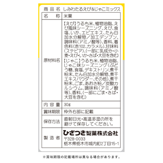 | 原材料名 | 【えび】うるち米、植物油脂、えび風味シーズニング、えび、食塩、いか、エビエキス、たん白加水分解物/加工デンプン、調味料(アミノ酸等)、香料、着色料(赤102、カラメル)、甘味料(ステビア)、(一部に乳成分・小麦・えび・いか・さば・大豆を含む) 【じゃこ】うるち米、植物油脂、じゃこ味シーズニング(ブドウ糖、食塩、デキストリン、煮干し粉末、たん白加水分解物、煮干しエキスパウダー、その他)、煮干粉末、ごま、あおさ粉/炭酸カルシウム、調味料(アミノ酸等)、香料、(一部にごま・さば・大豆を含む) |