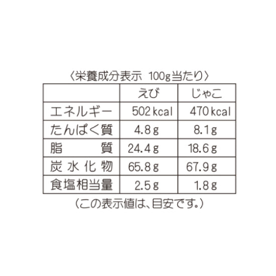 | 栄養成分 | (100gあたり) 【えび】エネルギー:502kcal、たんぱく質:4.8g、脂質:24.4g、炭水化物:65.8g、食塩相当量:2.5g 【じゃこ】エネルギー:470kcal、たんぱく質:8.1g、脂質:18.6g、炭水化物:67.9g、食塩相当量:1.8g |