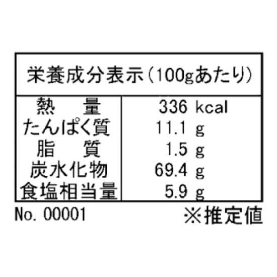 | 栄養成分 | (100gあたり)エネルギー:336kcal、たんぱく質:11.1g、脂質:1.5g、炭水化物:69.4g、食塩相当量:5.9g |