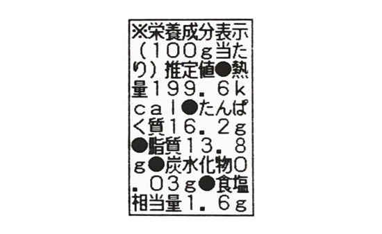| 栄養成分 | (100g当たり)エネルギー:199.6kcal、たんぱく質:16.2g、脂質:13.8g、炭水化物:0.03g、食塩相当量:1.6g |