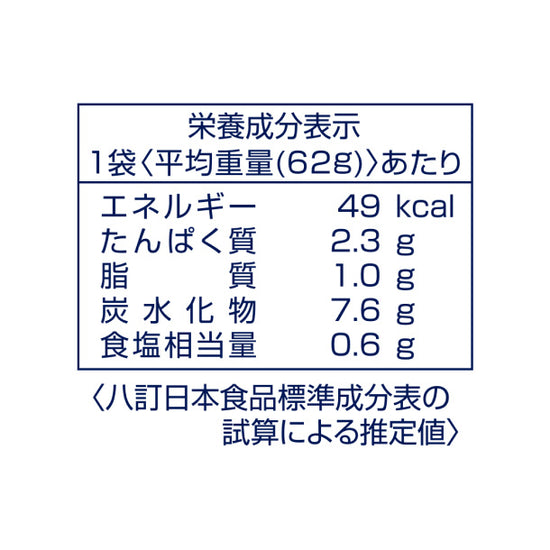 栄養成分 (1袋(平均重量62g)あたり)エネルギー:49kcal、たんぱく質:2.3g、脂質:1.0g、炭水化物:7.6g、食塩相当量:0.6g