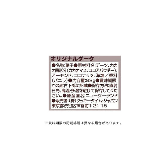 | 原材料名 | デーツ、カカオ固形分(カカオマス、ココアパウダー)、アーモンド、ココナッツ、海塩/香料(バニラ) ※本品は卵、乳、小麦、落花生などのナッツ類とえびを含む商品と共通の設備で製造加工しています。 |