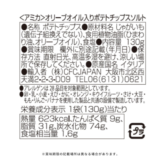 | 原材料名 | じゃがいも(遺伝子組換えでない)、食用植物油脂(ひまわり油、オリーブオイル)、食塩