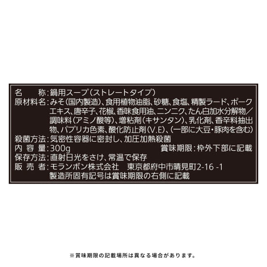 | 原材料名 | みそ(国内製造)、食用植物油脂、砂糖、食塩、精製ラード、ポークエキス、唐辛子、花椒、香味食用油、ニンニク、たん白加水分解物/調味料(アミノ酸等)、増粘剤(キサンタン)、乳化剤、香辛料抽出物、パプリカ色素、酸化防止剤(V.E)、(一部に大豆・豚肉を含む) |