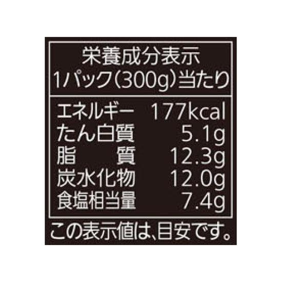 | 栄養成分 | (1パック300g当たり)エネルギー:177kcal、たんぱく質:5.1g、脂質:12.3g、炭水化物:12.0g、食塩相当量:7.4g |