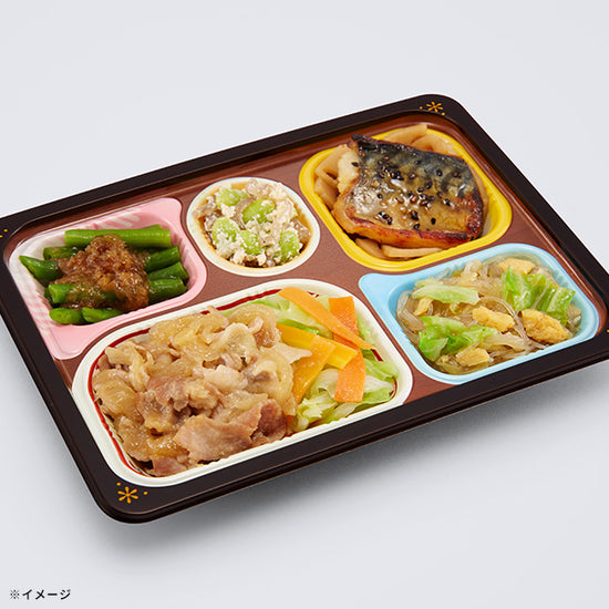 | 原材料名 | 豚肉(アメリカ)、玉ねぎ、さば、キャベツ、サヤインゲン、れんこん水煮、液体塩こうじ、枝豆、白和えの素(豆腐、米みそ、砂糖、その他)、濃口醤油、春雨、こんにゃく、上白糖、本みりん、清酒、おろししょうが、人参、炒り卵、焼肉のたれ、大豆油、ごま油、減塩醤油、顆粒和風だし、三温糖、ラー油、テンメンジャン、カツオ削りぶし、煎り黒ごま、食塩、酵母エキス、煎り白ごま、唐辛子/加エデンプン、糊料(加エデンプン、キサンタン)、調味料(アミノ酸等)、カラメル色素、凝固剤、pH調整剤、水酸化Ca、酸味料、酸化防止剤(V.C)、漂白剤(亜硫酸塩)、(一部に小麦・落花生・ごま・さば・大豆・豚肉・もも・りんご・ゼラチンを含む) |