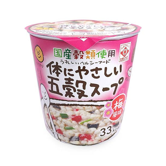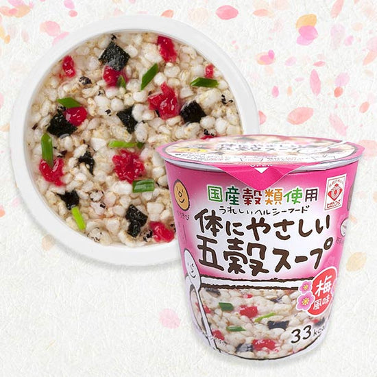 5つの穀類(玄米・黒米、胚芽押麦、もち粟、もちきび、小豆)を梅と鰹がベースの梅風味スープと一緒にお召し上がりください。