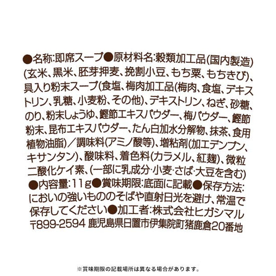 | 原材料名 | 穀類加工品(国内製造)(玄米、黒米、胚芽押麦、挽割小豆、もち粟、もちきび)、具入り粉末スープ(食塩、梅肉加工品(梅肉、食塩、デキストリン、乳糖、小麦粉、その他)、デキストリン、ねぎ、砂糖、のり、粉末しょうゆ、鰹節エキスパウダー、梅パウダー、鰹節粉末、昆布エキスパウダー、たん白加水分解物、抹茶、食用植物油脂)/調味料(アミノ酸等)、増粘剤(加工デンプン、キサンタン)、酸味料、着色料(カラメル、紅麹)、微粒二酸化ケイ素、(一部に乳成分・小麦・さば・大豆を含む) |