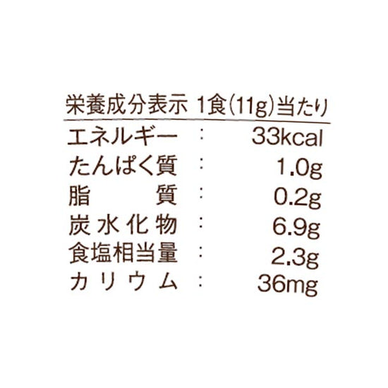 | 栄養成分 | (1食11g当たり)エネルギー:33kcal、たんぱく質:1.0g、脂質:0.2g、炭水化物:6.9g、食塩相当量:2.3g |