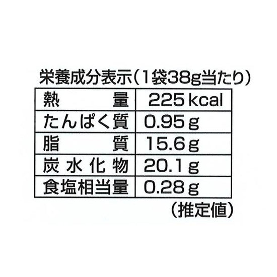 | 栄養成分 | (1袋38g当たり)エネルギー:225kcal、たんぱく質:0.95g、脂質:15.6g、炭水化物:20.1g、食塩相当量:0.28g |