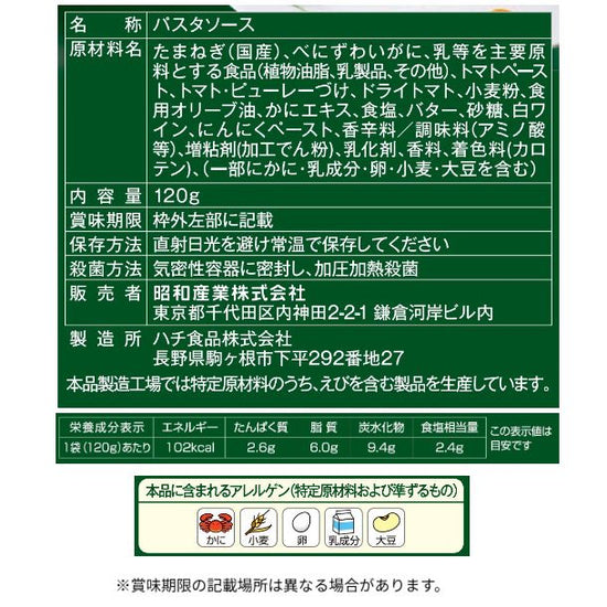 | 原材料名 | たまねぎ(国産)、べにずわいがに、乳等を主要原料とする食品(植物油脂、乳製品、その他)、トマトペースト、トマト・ピューレーづけ、ドライトマト、小麦粉、食用オリーブ油、かにエキス、食塩、バター、砂糖、白ワイン、にんにくペースト、香辛料/調味料(アミノ酸等)、増粘剤(加工でん粉)、乳化剤、香料、着色料(カロテン)、(一部にかに・乳成分・卵・小麦・大豆を含む) ※本品製造工場では特定原材料のうち、えびを含む製品を生産しています。 |