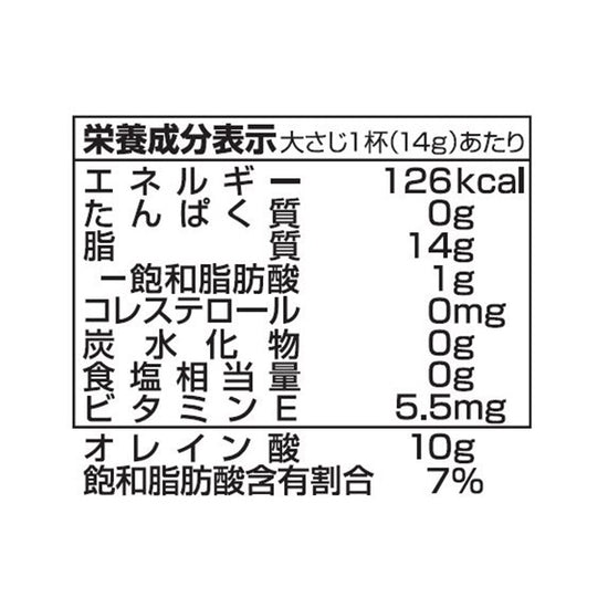 | 栄養成分 | (大さじ1杯14gあたり)エネルギー:126kcal、たんぱく質:0g、脂質:14g、炭水化物:0g、食塩相当量:0g |