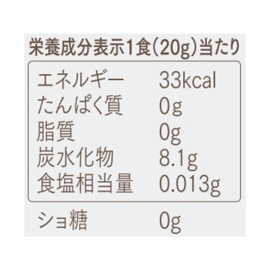 | 栄養成分 | (1食(20g当たり))エネルギー:33kcal、たんぱく質:0g、脂質:0g、炭水化物:8.1g、食塩相当量:0.013g |
