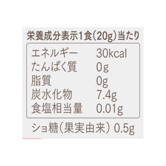 | 栄養成分 | (1食(20g)当たり)エネルギー:30kcal、たんぱく質:0g、脂質:0g、炭水化物:7.4g、食塩相当量:0.01g |