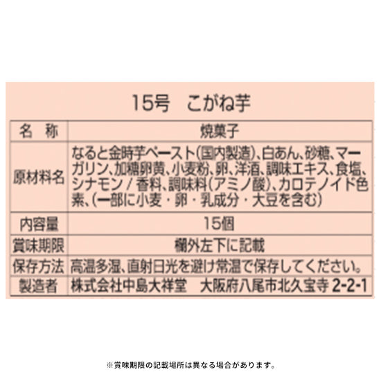 | 原材料名 | なると金時芋ペースト(国内製造)、白あん、砂糖、マーガリン、加糖卵黄、小麦粉、卵、洋酒、調味エキス、食塩、シナモン/香料、調味料(アミノ酸)、カロテノイド色素、(一部に小麦・卵・乳成分・大豆を含む) ※本製品の製造ラインでは、くるみを使用した製品を製造しています。 |