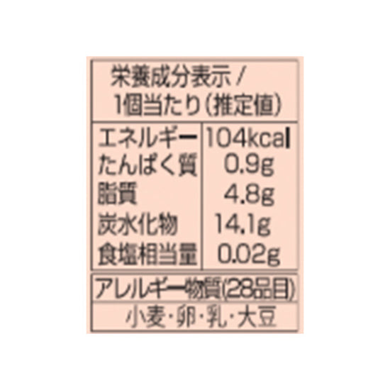 | 栄養成分 | (1個当たり)エネルギー:104kcal、たんぱく質:0.9g、脂質:4.8g、炭水化物:14.1g、食塩相当量:0.02g |