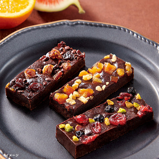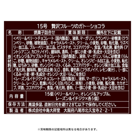 | 原材料名 | 【ベリー&ベリー】チョコレート(国内製造)、卵、マーガリン、クランベリー砂糖漬(クランベリー、砂糖、植物油脂)、キャラメルペースト、クリーム、小麦粉、砂糖、転化糖、ラズベリー加工品、ブルーベリー加工品、ピスタチオ、ココアパウダー、食塩/乳化剤、着色料(アントシアニン、カロテノイド)、酸味料、香料、(一部に小麦・卵・乳成分・大豆を含む) 【オレンジ&アップル】チョコレート(国内製造)、液卵、マーガリン、りんご砂糖漬(りんご、砂糖、植物油脂)、キャラメルペースト、クリーム、オレンジピール加工品、小麦粉、転化糖、はちみつ、砂糖、オレンジペースト、くるみ、 ココアパウダー、オレンジ果汁加工品、食塩/乳化剤、酸味料、酸化防止剤(V.C)、香料、着色料(フラボノイド、レモン果汁)、(一部にくるみ・小麦・卵・乳成分・オレンジ・大豆・りんごを含む) 【レーズン&イチジク】チョコレート(国内製造)、液卵、マーガリン、キャラメルペースト、クリーム、レーズン、乾燥いちじく(白いちじく、米粉)、小麦粉、砂糖、転化糖、カカオニブ、洋酒、ココアパウダー、食塩/乳化剤、香料、(一部に小麦・卵・乳成分・大豆を含む) ※本品製造工場ではくるみを含む製品を製造しております。 |