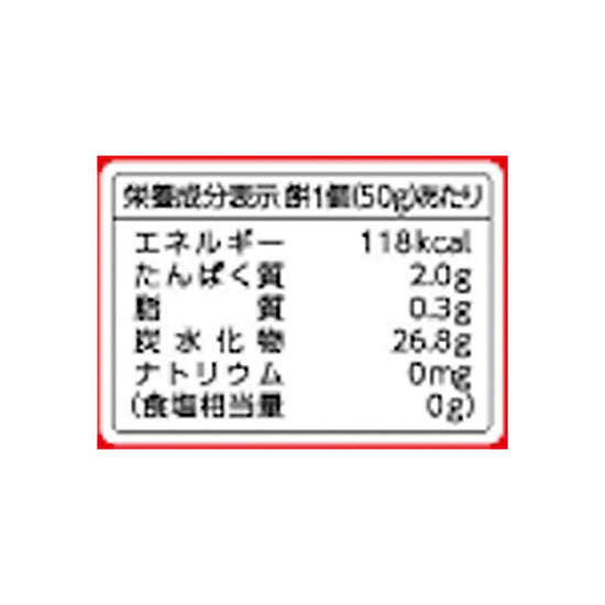 | 栄養成分 | (50gあたり)エネルギー:118kcal、たんぱく質:2.0g、脂質:0.3g、炭水化物:26.8g、食塩相当量:0g |