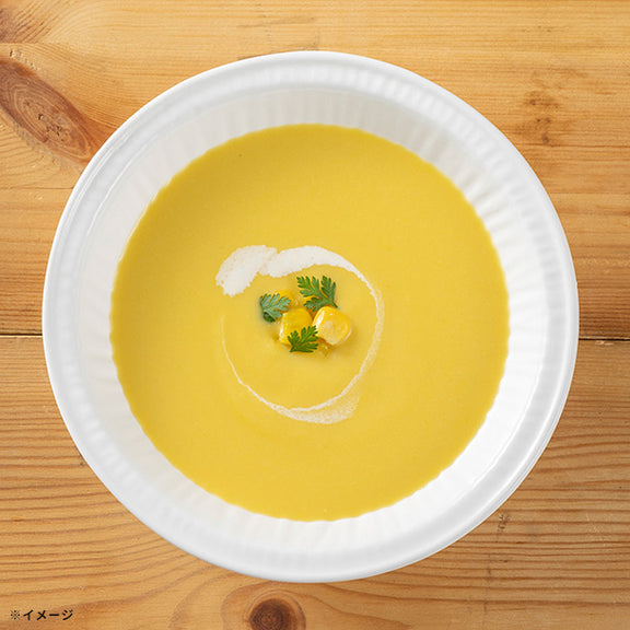 とうもろこしを玉ねぎと炒めて甘みを引き出し、牛乳と生クリームでコクをプラスした、なめらかなポタージュです。