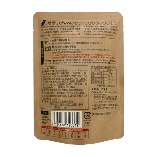 | 原材料名 | さつまいも(新潟市産)、オニオンソテー、カレールウ、牛脂、砂糖、香辛料、植物油脂、しょうゆ、トマトペースト、ウスターソース、チャツネ、酵母エキスパウダー、カレーパウダー、野菜エキス、濃縮りんご果汁、ビーフエキス、食塩/カラメル色素、香料、調味料(アミノ酸等)、増粘剤(加工デンプン、キサンタン)、酸味料、(一部に小麦・乳成分・牛肉・大豆・鶏肉・バナナ・豚肉・りんごを含む)